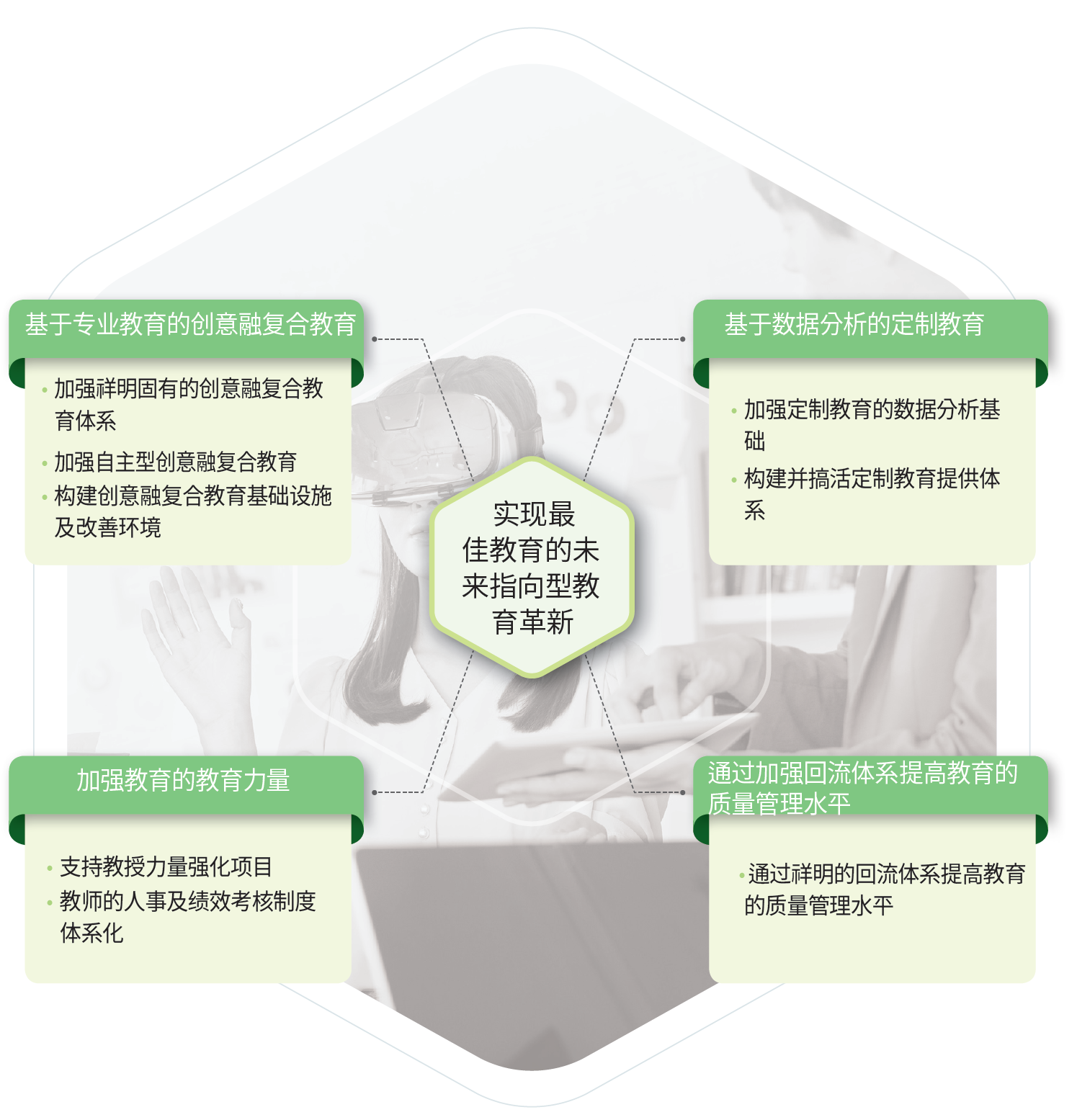实现最佳教育的未来指向型教育革新 基于专业教育的创意融复合教育 ·加强祥明固有的创意融复合教育体系 ·加强自主型创意融复合教育 ·构建创意融复合教育基础设施及改善环境 基于数据分析的定制教育 ·加强定制教育的数据分析基础 ·构建并搞活定制教育提供体系 加强教育的教育力量 ·支持教授力量强化项目 ·教师的人事及绩效考核制度体系化 通过加强回流体系提高教育的质量管理水平 ·通过祥明的回流体系提高教育的质量管理水平