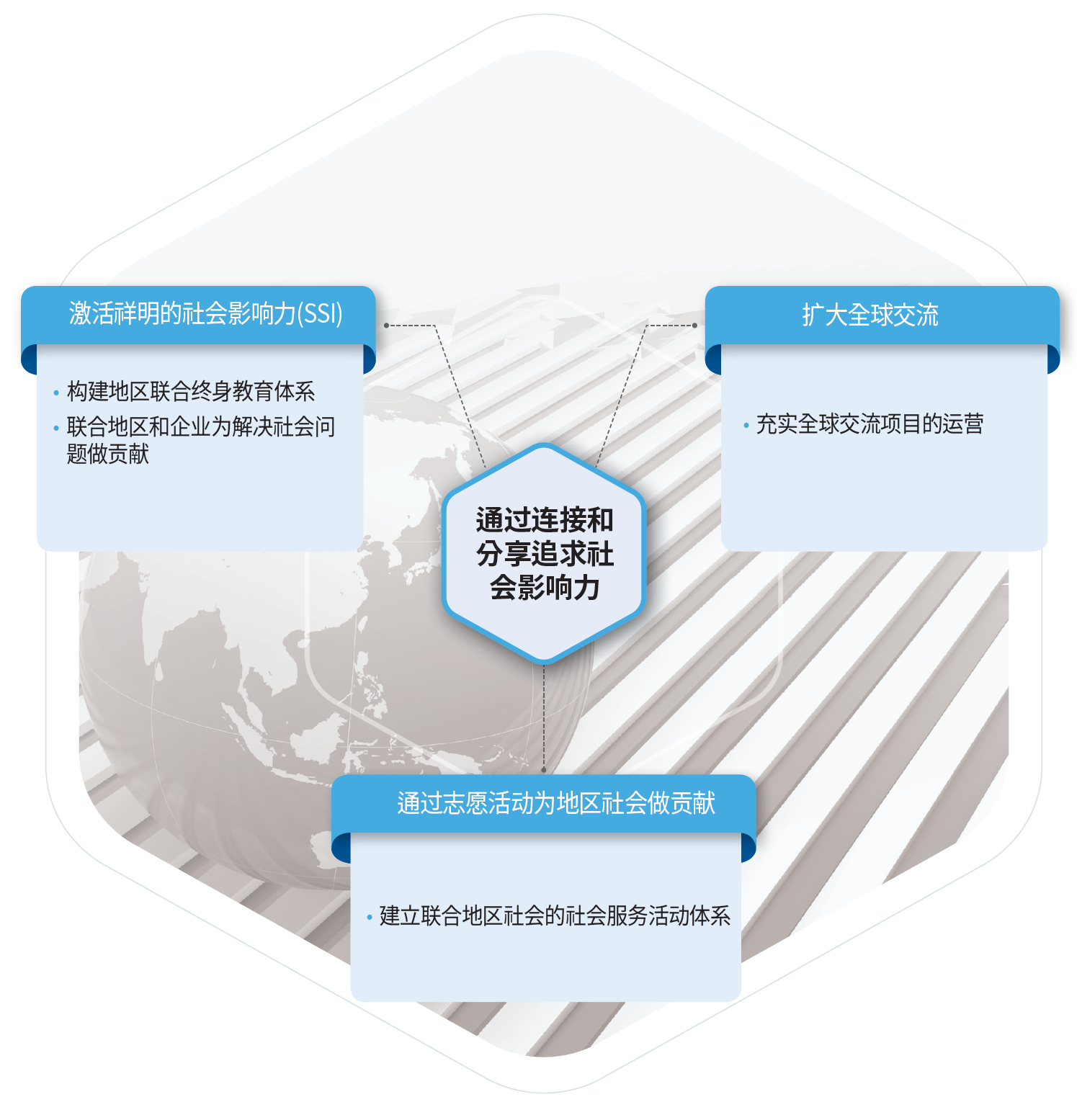 연결·나눔을 통한 소셜임팩트 추구 상명 소셜임팩트(SSI) 활성화 • 지역 연계 평생교육 시스템 구축 • 지역 및 기업과 연계한 사회문제해결 기여 通过连接和分享追求社会影响力 激活祥明的社会影响力(SSI) ·构建地区联合终身教育体系 ·联合地区和企业为解决社会问题做贡献 글로벌 교류 확대 • 글로벌 교류 프로그램 운영의내실화 扩大全球交流 ·充实全球交流项目的运营 봉사활동을 통한 지역사회 공헌 • 지역 사회 연계 사회 봉사 활동 체계화 通过志愿活动为地区社会做贡献 ·建立联合地区社会的社会服务活动体系