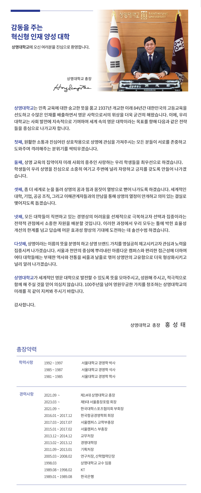 | 경력사항 | 2021.09 ~ | 제4대 상명대학교 총장 |