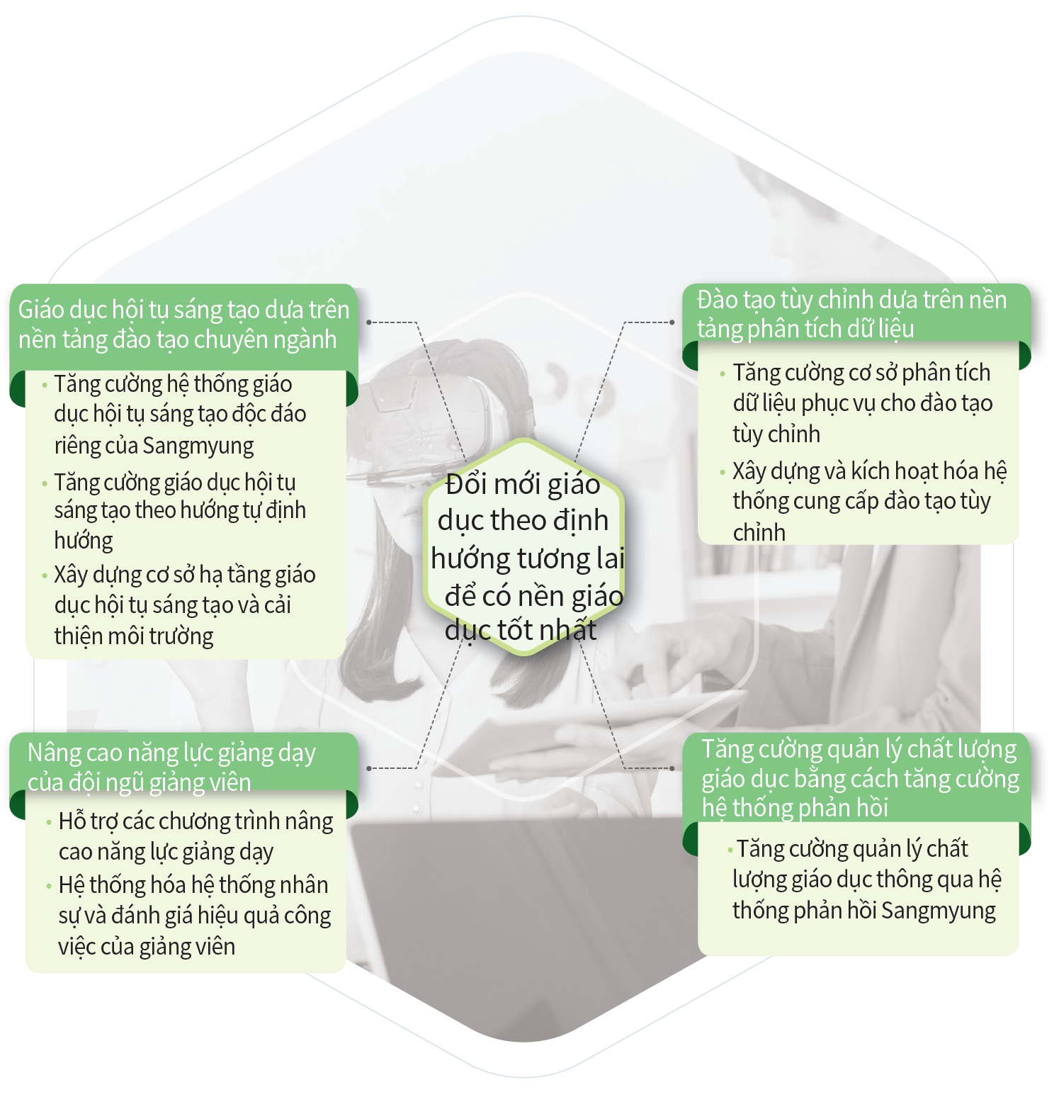 Đổi mới giáo dục theo định hướng tương lai để có nền giáo dục tốt nhất Giáo dục hội tụ sáng tạo dựa trên nền tảng đào tạo chuyên ngành • Tăng cường hệ thống giáo dục hội tụ sáng tạo độc đáo riêng của Sangmyung • Tăng cường giáo dục hội tụ sáng tạo theo hướng tự định hướng • Xây dựng cơ sở hạ tầng giáo dục hội tụ sáng tạo và cải thiện môi trường Đào tạo tùy chỉnh dựa trên nền tảng phân tích dữ liệu • Tăng cường cơ sở phân tích dữ liệu phục vụ cho đào tạo tùy chỉnh • Xây dựng và kích hoạt hóa hệ thống cung cấp đào tạo tùy chỉnh Nâng cao năng lực giảng dạy của đội ngũ giảng viên • Hỗ trợ các chương trình nâng cao năng lực giảng dạy • Hệ thống hóa hệ thống nhân sự và đánh giá hiệu quả công việc của giảng viên Tăng cường quản lý chất lượng giáo dục bằng cách tăng cường hệ thống phản hồi • Tăng cường quản lý chất lượng giáo dục thông qua hệ thống phản hồi Sangmyung
